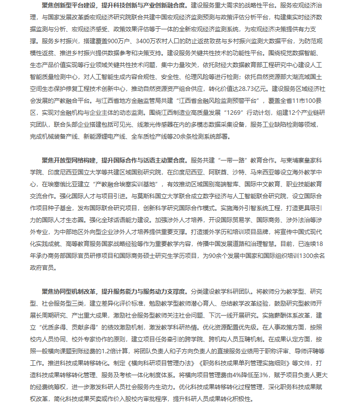 报道指出,江西财经大学认真学习贯彻习近平总书记关于教育的重要论述,聚焦复合型人才培养、创新型平台建设、开放型网络构建、协同型机制改革,紧密对接国家重大战略和区域经济社会发展需求,全面提升行业大学服务经济社会高质量发展能力。